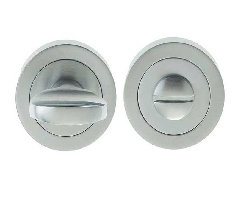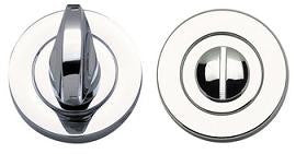 JV422 50mm x 10mm rose - Popular choice in our range this designer Bathroom turn and release mechanism will compliment any door handle on a round rose nicely. Â Available in Satin Chrome, Polished Chrome, Dual finish Polished/Satin Chrome and also Polished Brass. Â Comes complete with 5mm spindle and fixing screws.