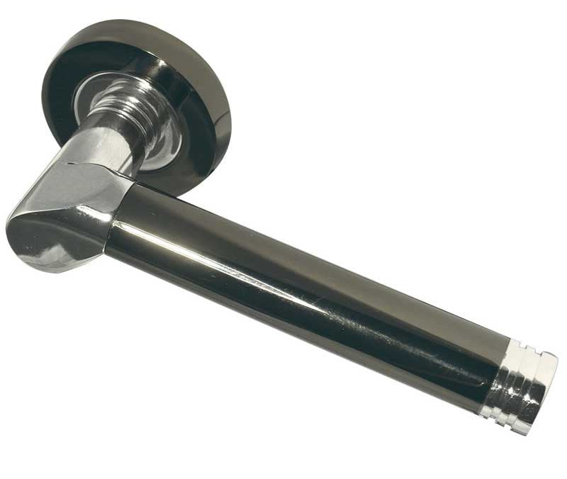 Octavia levers on round rose in super cool Chrome and Black Nickel dual finish. Currently on promotion whilst current stocks last. Sold and supplied as a complete pair of handles with connecting spindle and bolt fixing pack. If you need assistance with matching items such as locks and keyholes etc then see the matching BATHROOM TURN & RELEASE - matching BATHROOM DEADBOLT - matching KEYHOLE - matching MORTICE LATCH - matching HINGES. All other items to compliment are in 'RELATED PRODUCTS' below.