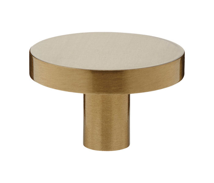 Contemporary gold brushed satin brass disc shape kitchen/cupboard pulls. Perfect for injecting your furniture with metallic decor. These modern satin brass cylinder pulls are ideal for revamping your chest of drawers, bedroom furniture, cupboards, kitchen cabinets and dressers.